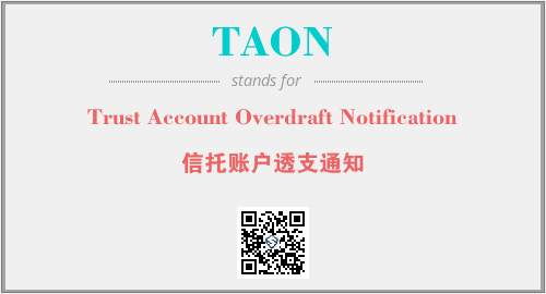 上述内容是“Trust Account Overdraft Notification”作为“TAON”的缩写,解释为“信托账户透支通知”时的信息,以及英文缩略词TAON所代表的英文单词,其对应的中文拼音、详细解释以及在英文中的流行度和相关分类、应用领域及应用示例等。