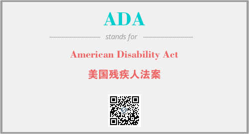 英文缩略词“ADA”经常作为“American Disability Act”的英文缩写来使用,中文表示:“美国残疾人法案”。本文将详细介绍英文缩写词ADA所代表英文单词,其对应的中文拼音、详细解释以及在英语中的流行度。此外,还有关于缩略词ADA的分类、应用领域及相关应用示例等。