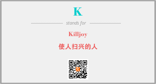 英文缩略词“K”经常作为“Killjoy”的英文缩写来使用,中文表示:“使人扫兴的人”。本文将详细介绍英文缩写词K所代表英文单词,其对应的中文拼音、详细解释以及在英语中的流行度。此外,还有关于缩略词K的分类、应用领域及相关应用示例等。