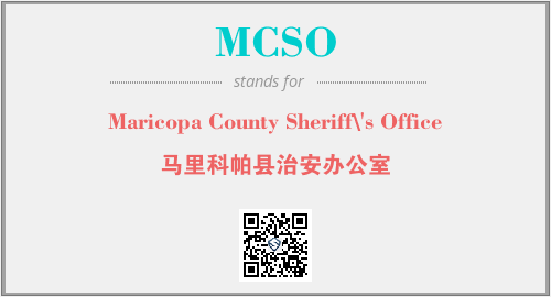 上述内容是“Maricopa County Sheriff\'s Office”作为“MCSO”的缩写,解释为“马里科帕县治安办公室”时的信息,以及英文缩略词MCSO所代表的英文单词,其对应的中文拼音、详细解释以及在英文中的流行度和相关分类、应用领域及应用示例等。