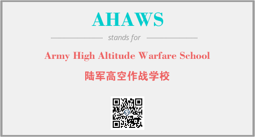 上述内容是“Army High Altitude Warfare School”作为“AHAWS”的缩写,解释为“陆军高空作战学校”时的信息,以及英文缩略词AHAWS所代表的英文单词,其对应的中文拼音、详细解释以及在英文中的流行度和相关分类、应用领域及应用示例等。