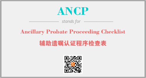 上述内容是“Ancillary Probate Proceeding Checklist”作为“ANCP”的缩写,解释为“辅助遗嘱认证程序检查表”时的信息,以及英文缩略词ANCP所代表的英文单词,其对应的中文拼音、详细解释以及在英文中的流行度和相关分类、应用领域及应用示例等。