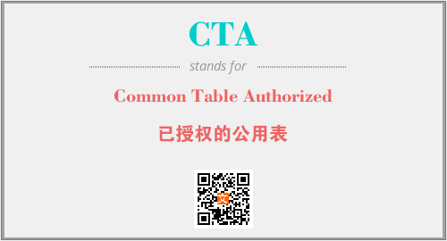 上述内容是“Common Table Authorized”作为“CTA”的缩写,解释为“已授权的公用表”时的信息,以及英文缩略词CTA所代表的英文单词,其对应的中文拼音、详细解释以及在英文中的流行度和相关分类、应用领域及应用示例等。