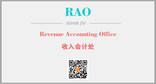 上述内容是“Revenue Accounting Office”作为“RAO”的缩写,解释为“收入会计处”时的信息,以及英文缩略词RAO所代表的英文单词,其对应的中文拼音、详细解释以及在英文中的流行度和相关分类、应用领域及应用示例等。