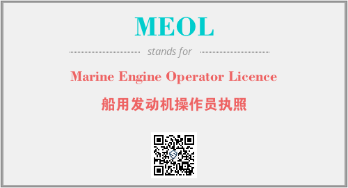 英文缩略词“MEOL”经常作为“Marine Engine Operator Licence”的英文缩写来使用,中文表示:“船用发动机操作员执照”。本文将详细介绍英文缩写词MEOL所代表英文单词,其对应的中文拼音、详细解释以及在英语中的流行度。此外,还有关于缩略词MEOL的分类、应用领域及相关应用示例等。