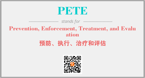 上述内容是“Prevention, Enforcement, Treatment, and Evaluation”作为“PETE”的缩写,解释为“预防、执行、治疗和评估”时的信息,以及英文缩略词PETE所代表的英文单词,其对应的中文拼音、详细解释以及在英文中的流行度和相关分类、应用领域及应用示例等。