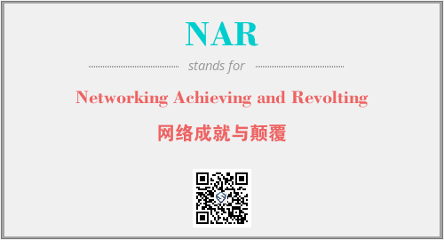 上述内容是“Networking Achieving and Revolting”作为“NAR”的缩写,解释为“网络成就与颠覆”时的信息,以及英文缩略词NAR所代表的英文单词,其对应的中文拼音、详细解释以及在英文中的流行度和相关分类、应用领域及应用示例等。