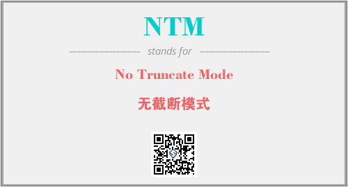 英文缩略词“NTM”经常作为“No Truncate Mode”的英文缩写来使用,中文表示:“无截断模式”。本文将详细介绍英文缩写词NTM所代表英文单词,其对应的中文拼音、详细解释以及在英语中的流行度。此外,还有关于缩略词NTM的分类、应用领域及相关应用示例等。