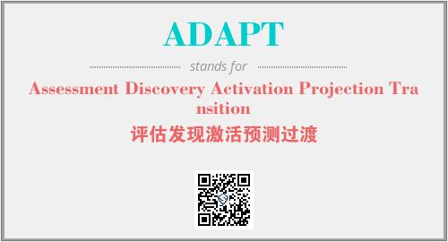 上述内容是“Assessment Discovery Activation Projection Transition”作为“ADAPT”的缩写,解释为“评估发现激活预测过渡”时的信息,以及英文缩略词ADAPT所代表的英文单词,其对应的中文拼音、详细解释以及在英文中的流行度和相关分类、应用领域及应用示例等。