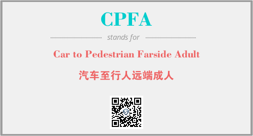 英文缩略词“CPFA”经常作为“Car to Pedestrian Farside Adult”的英文缩写来使用,中文表示:“汽车至行人远端成人”。本文将详细介绍英文缩写词CPFA所代表英文单词,其对应的中文拼音、详细解释以及在英语中的流行度。此外,还有关于缩略词CPFA的分类、应用领域及相关应用示例等。