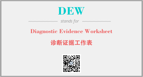 上述内容是“Diagnostic Evidence Worksheet”作为“DEW”的缩写,解释为“诊断证据工作表”时的信息,以及英文缩略词DEW所代表的英文单词,其对应的中文拼音、详细解释以及在英文中的流行度和相关分类、应用领域及应用示例等。