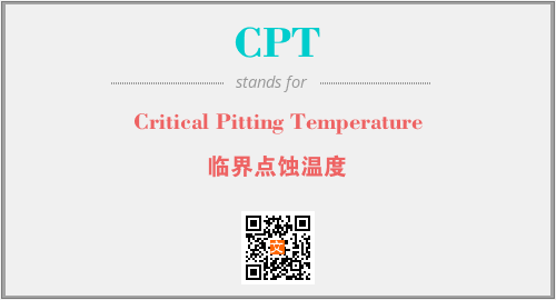 英文缩略词“CPT”经常作为“Critical Pitting Temperature”的英文缩写来使用,中文表示:“临界点蚀温度”。本文将详细介绍英文缩写词CPT所代表英文单词,其对应的中文拼音、详细解释以及在英语中的流行度。此外,还有关于缩略词CPT的分类、应用领域及相关应用示例等。