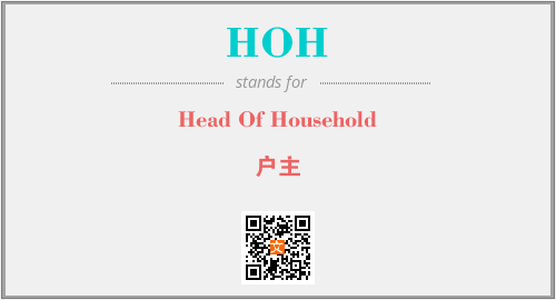 上述内容是“Head Of Household”作为“HOH”的缩写,解释为“户主”时的信息,以及英文缩略词HOH所代表的英文单词,其对应的中文拼音、详细解释以及在英文中的流行度和相关分类、应用领域及应用示例等。