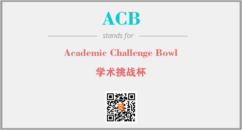 英文缩略词“ACB”经常作为“Academic Challenge Bowl”的英文缩写来使用,中文表示:“学术挑战杯”。本文将详细介绍英文缩写词ACB所代表英文单词,其对应的中文拼音、详细解释以及在英语中的流行度。此外,还有关于缩略词ACB的分类、应用领域及相关应用示例等。