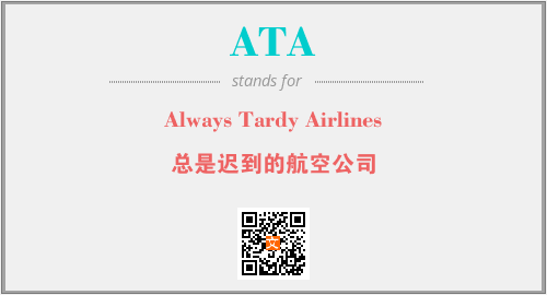 英文缩略词“ATA”经常作为“Always Tardy Airlines”的英文缩写来使用,中文表示:“总是迟到的航空公司”。本文将详细介绍英文缩写词ATA所代表英文单词,其对应的中文拼音、详细解释以及在英语中的流行度。此外,还有关于缩略词ATA的分类、应用领域及相关应用示例等。