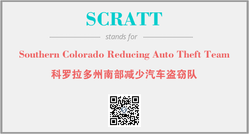 上述内容是“Southern Colorado Reducing Auto Theft Team”作为“SCRATT”的缩写,解释为“科罗拉多州南部减少汽车盗窃队”时的信息,以及英文缩略词SCRATT所代表的英文单词,其对应的中文拼音、详细解释以及在英文中的流行度和相关分类、应用领域及应用示例等。