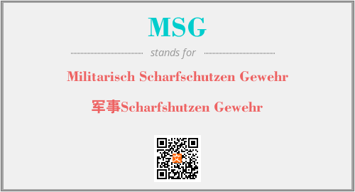 英文缩略词“MSG”经常作为“Militarisch Scharfschutzen Gewehr”的英文缩写来使用,中文表示:“军事Scharfshutzen Gewehr”。本文将详细介绍英文缩写词MSG所代表英文单词,其对应的中文拼音、详细解释以及在英语中的流行度。此外,还有关于缩略词MSG的分类、应用领域及相关应用示例等。