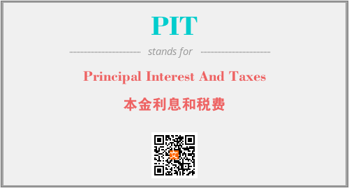 英文缩略词“PIT”经常作为“Principal Interest And Taxes”的英文缩写来使用,中文表示:“本金利息和税费”。本文将详细介绍英文缩写词PIT所代表英文单词,其对应的中文拼音、详细解释以及在英语中的流行度。此外,还有关于缩略词PIT的分类、应用领域及相关应用示例等。