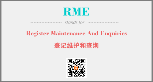 英文缩略词“RME”经常作为“Register Maintenance And Enquiries”的英文缩写来使用,中文表示:“登记维护和查询”。本文将详细介绍英文缩写词RME所代表英文单词,其对应的中文拼音、详细解释以及在英语中的流行度。此外,还有关于缩略词RME的分类、应用领域及相关应用示例等。