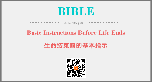 英文缩略词“BIBLE”经常作为“Basic Instructions Before Life Ends”的英文缩写来使用,中文表示:“生命结束前的基本指示”。本文将详细介绍英文缩写词BIBLE所代表英文单词,其对应的中文拼音、详细解释以及在英语中的流行度。此外,还有关于缩略词BIBLE的分类、应用领域及相关应用示例等。