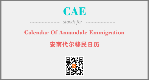 上述内容是“Calendar Of Annandale Emmigration”作为“CAE”的缩写,解释为“安南代尔移民日历”时的信息,以及英文缩略词CAE所代表的英文单词,其对应的中文拼音、详细解释以及在英文中的流行度和相关分类、应用领域及应用示例等。