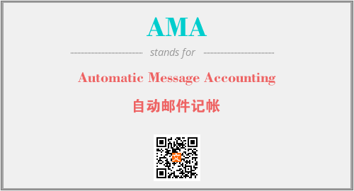 英文缩略词“AMA”经常作为“Automatic Message Accounting”的英文缩写来使用,中文表示:“自动邮件记帐”。本文将详细介绍英文缩写词AMA所代表英文单词,其对应的中文拼音、详细解释以及在英语中的流行度。此外,还有关于缩略词AMA的分类、应用领域及相关应用示例等。