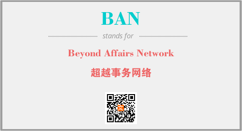 上述内容是“Beyond Affairs Network”作为“BAN”的缩写,解释为“超越事务网络”时的信息,以及英文缩略词BAN所代表的英文单词,其对应的中文拼音、详细解释以及在英文中的流行度和相关分类、应用领域及应用示例等。