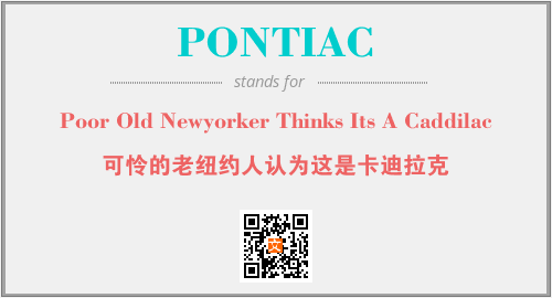 上述内容是“Poor Old Newyorker Thinks Its A Caddilac”作为“PONTIAC”的缩写,解释为“可怜的老纽约人认为这是卡迪拉克”时的信息,以及英文缩略词PONTIAC所代表的英文单词,其对应的中文拼音、详细解释以及在英文中的流行度和相关分类、应用领域及应用示例等。