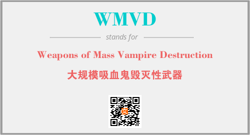 英文缩略词“WMVD”经常作为“Weapons of Mass Vampire Destruction”的英文缩写来使用,中文表示:“大规模吸血鬼毁灭性武器”。本文将详细介绍英文缩写词WMVD所代表英文单词,其对应的中文拼音、详细解释以及在英语中的流行度。此外,还有关于缩略词WMVD的分类、应用领域及相关应用示例等。