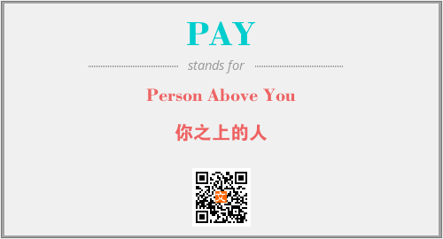 上述内容是“Person Above You”作为“PAY”的缩写,解释为“你之上的人”时的信息,以及英文缩略词PAY所代表的英文单词,其对应的中文拼音、详细解释以及在英文中的流行度和相关分类、应用领域及应用示例等。