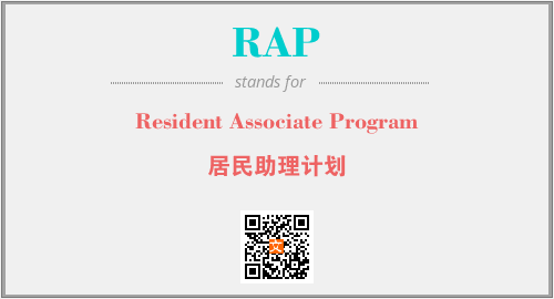 上述内容是“Resident Associate Program”作为“RAP”的缩写,解释为“居民助理计划”时的信息,以及英文缩略词RAP所代表的英文单词,其对应的中文拼音、详细解释以及在英文中的流行度和相关分类、应用领域及应用示例等。