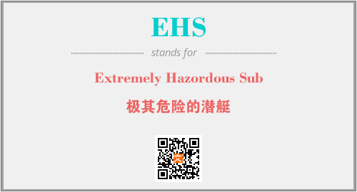 英文缩略词“EHS”经常作为“Extremely Hazordous Sub”的英文缩写来使用,中文表示:“极其危险的潜艇”。本文将详细介绍英文缩写词EHS所代表英文单词,其对应的中文拼音、详细解释以及在英语中的流行度。此外,还有关于缩略词EHS的分类、应用领域及相关应用示例等。