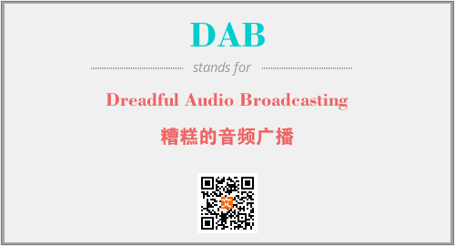 上述内容是“Dreadful Audio Broadcasting”作为“DAB”的缩写,解释为“糟糕的音频广播”时的信息,以及英文缩略词DAB所代表的英文单词,其对应的中文拼音、详细解释以及在英文中的流行度和相关分类、应用领域及应用示例等。