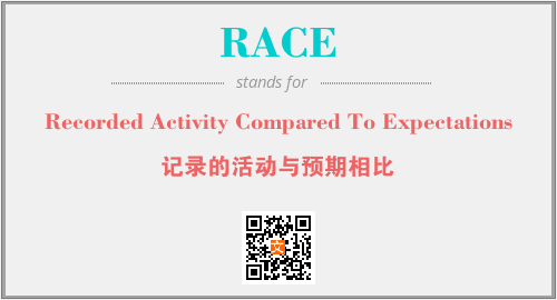 上述内容是“Recorded Activity Compared To Expectations”作为“RACE”的缩写,解释为“记录的活动与预期相比”时的信息,以及英文缩略词RACE所代表的英文单词,其对应的中文拼音、详细解释以及在英文中的流行度和相关分类、应用领域及应用示例等。
