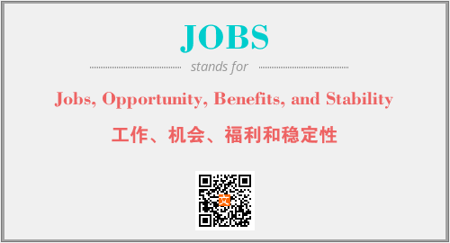 上述内容是“Jobs, Opportunity, Benefits, and Stability”作为“JOBS”的缩写,解释为“工作、机会、福利和稳定性”时的信息,以及英文缩略词JOBS所代表的英文单词,其对应的中文拼音、详细解释以及在英文中的流行度和相关分类、应用领域及应用示例等。