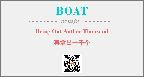 英文缩略词“BOAT”经常作为“Bring Out Anther Thousand”的英文缩写来使用,中文表示:“再拿出一千个”。本文将详细介绍英文缩写词BOAT所代表英文单词,其对应的中文拼音、详细解释以及在英语中的流行度。此外,还有关于缩略词BOAT的分类、应用领域及相关应用示例等。