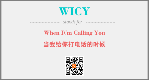上述内容是“When I\'m Calling You”作为“WICY”的缩写,解释为“当我给你打电话的时候”时的信息,以及英文缩略词WICY所代表的英文单词,其对应的中文拼音、详细解释以及在英文中的流行度和相关分类、应用领域及应用示例等。