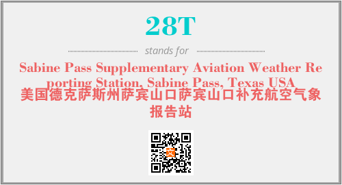 英文缩略词“28T”经常作为“Sabine Pass Supplementary Aviation Weather Reporting Station, Sabine Pass, Texas USA”的英文缩写来使用,中文表示:“美国德克萨斯州萨宾山口萨宾山口补充航空气象报告站”。本文将详细介绍英文缩写词28T所代表英文单词,其对应的中文拼音、详细解释以及在英语中的流行度。此外,还有关于缩略词28T的分类、应用领域及相关应用示例等。