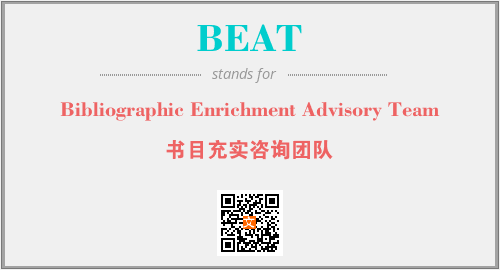 上述内容是“Bibliographic Enrichment Advisory Team”作为“BEAT”的缩写,解释为“书目充实咨询团队”时的信息,以及英文缩略词BEAT所代表的英文单词,其对应的中文拼音、详细解释以及在英文中的流行度和相关分类、应用领域及应用示例等。