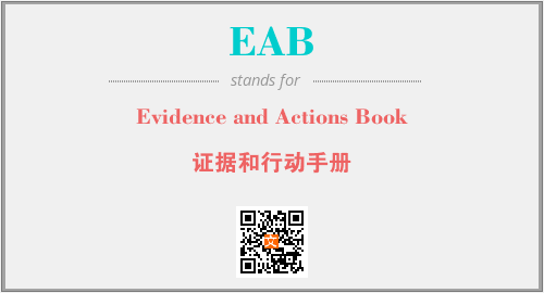 上述内容是“Evidence and Actions Book”作为“EAB”的缩写,解释为“证据和行动手册”时的信息,以及英文缩略词EAB所代表的英文单词,其对应的中文拼音、详细解释以及在英文中的流行度和相关分类、应用领域及应用示例等。