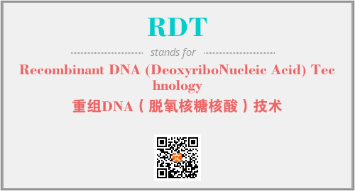 上述内容是“Recombinant DNA (DeoxyriboNucleic Acid) Technology”作为“RDT”的缩写,解释为“重组DNA(脱氧核糖核酸)技术”时的信息,以及英文缩略词RDT所代表的英文单词,其对应的中文拼音、详细解释以及在英文中的流行度和相关分类、应用领域及应用示例等。