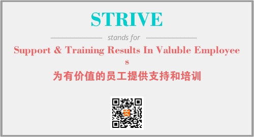 上述内容是“Support & Training Results In Valuble Employees”作为“STRIVE”的缩写,解释为“为有价值的员工提供支持和培训”时的信息,以及英文缩略词STRIVE所代表的英文单词,其对应的中文拼音、详细解释以及在英文中的流行度和相关分类、应用领域及应用示例等。