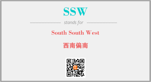 上述内容是“South South West”作为“SSW”的缩写,解释为“西南偏南”时的信息,以及英文缩略词SSW所代表的英文单词,其对应的中文拼音、详细解释以及在英文中的流行度和相关分类、应用领域及应用示例等。