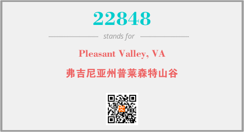 上述内容是“Pleasant Valley, VA”作为“22848”的缩写,解释为“弗吉尼亚州普莱森特山谷”时的信息,以及英文缩略词22848所代表的英文单词,其对应的中文拼音、详细解释以及在英文中的流行度和相关分类、应用领域及应用示例等。