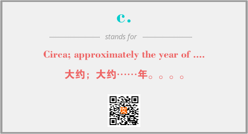 上述内容是“Circa; approximately the year of ....”作为“c.”的缩写,解释为“大约;大约……年。。。。”时的信息,以及英文缩略词c.所代表的英文单词,其对应的中文拼音、详细解释以及在英文中的流行度和相关分类、应用领域及应用示例等。