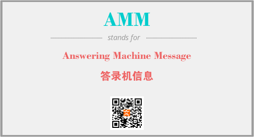 英文缩略词“AMM”经常作为“Answering Machine Message”的英文缩写来使用,中文表示:“答录机信息”。本文将详细介绍英文缩写词AMM所代表英文单词,其对应的中文拼音、详细解释以及在英语中的流行度。此外,还有关于缩略词AMM的分类、应用领域及相关应用示例等。