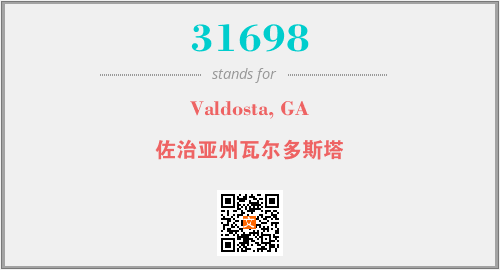 上述内容是“Valdosta, GA”作为“31698”的缩写,解释为“佐治亚州瓦尔多斯塔”时的信息,以及英文缩略词31698所代表的英文单词,其对应的中文拼音、详细解释以及在英文中的流行度和相关分类、应用领域及应用示例等。