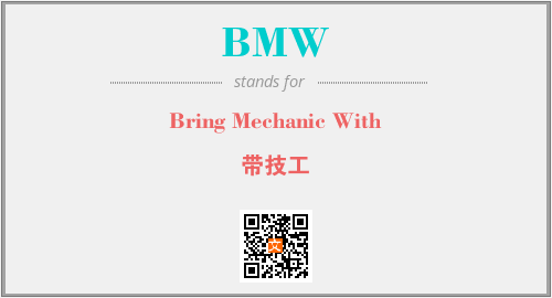 英文缩略词“BMW”经常作为“Bring Mechanic With”的英文缩写来使用,中文表示:“带技工”。本文将详细介绍英文缩写词BMW所代表英文单词,其对应的中文拼音、详细解释以及在英语中的流行度。此外,还有关于缩略词BMW的分类、应用领域及相关应用示例等。