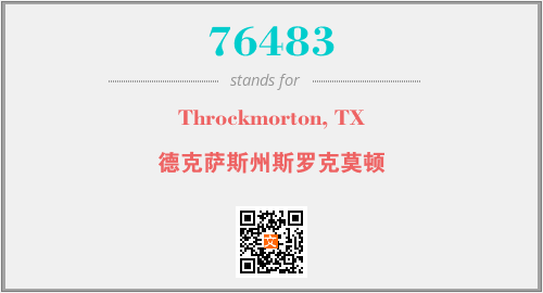 上述内容是“Throckmorton, TX”作为“76483”的缩写,解释为“德克萨斯州斯罗克莫顿”时的信息,以及英文缩略词76483所代表的英文单词,其对应的中文拼音、详细解释以及在英文中的流行度和相关分类、应用领域及应用示例等。