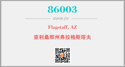 上述内容是“Flagstaff, AZ”作为“86003”的缩写,解释为“亚利桑那州弗拉格斯塔夫”时的信息,以及英文缩略词86003所代表的英文单词,其对应的中文拼音、详细解释以及在英文中的流行度和相关分类、应用领域及应用示例等。